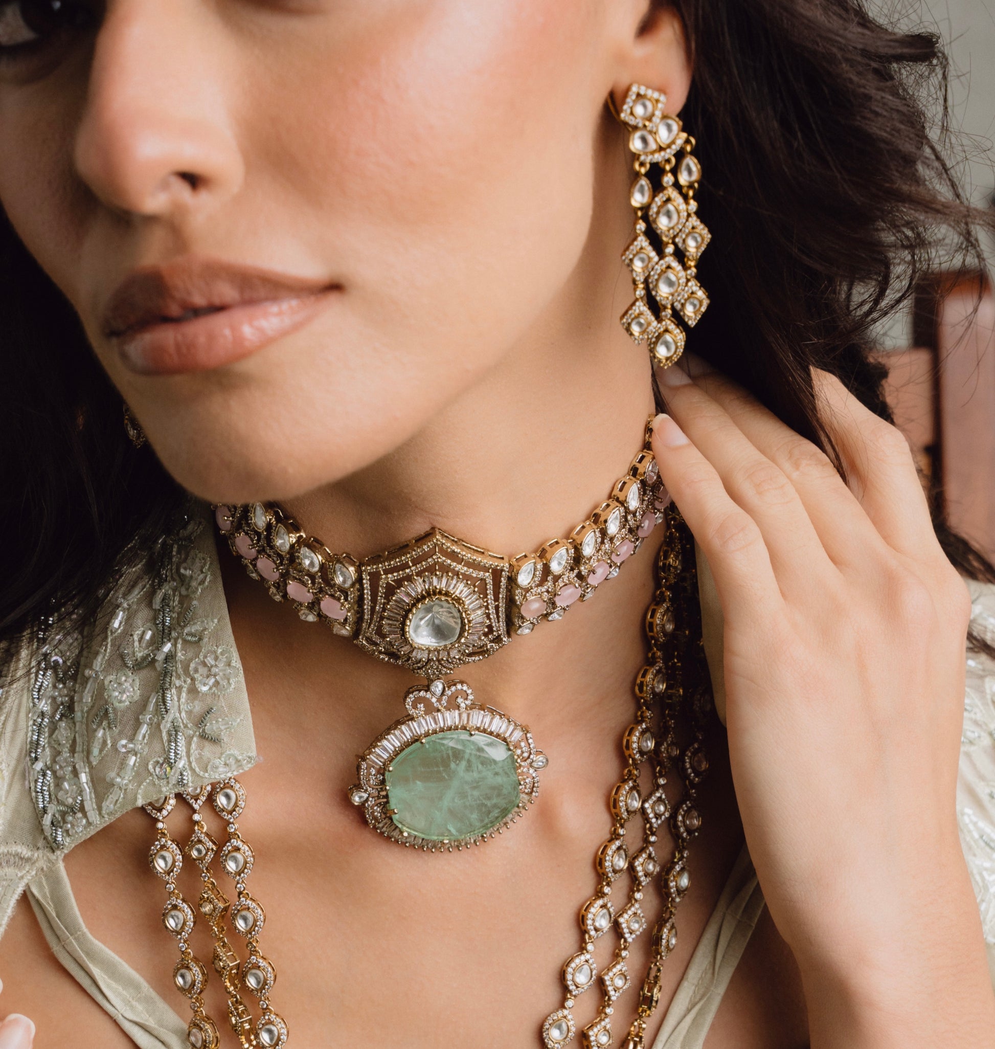 A structured choker with a striking green pendant centerpiece, balanced by stone detailing.